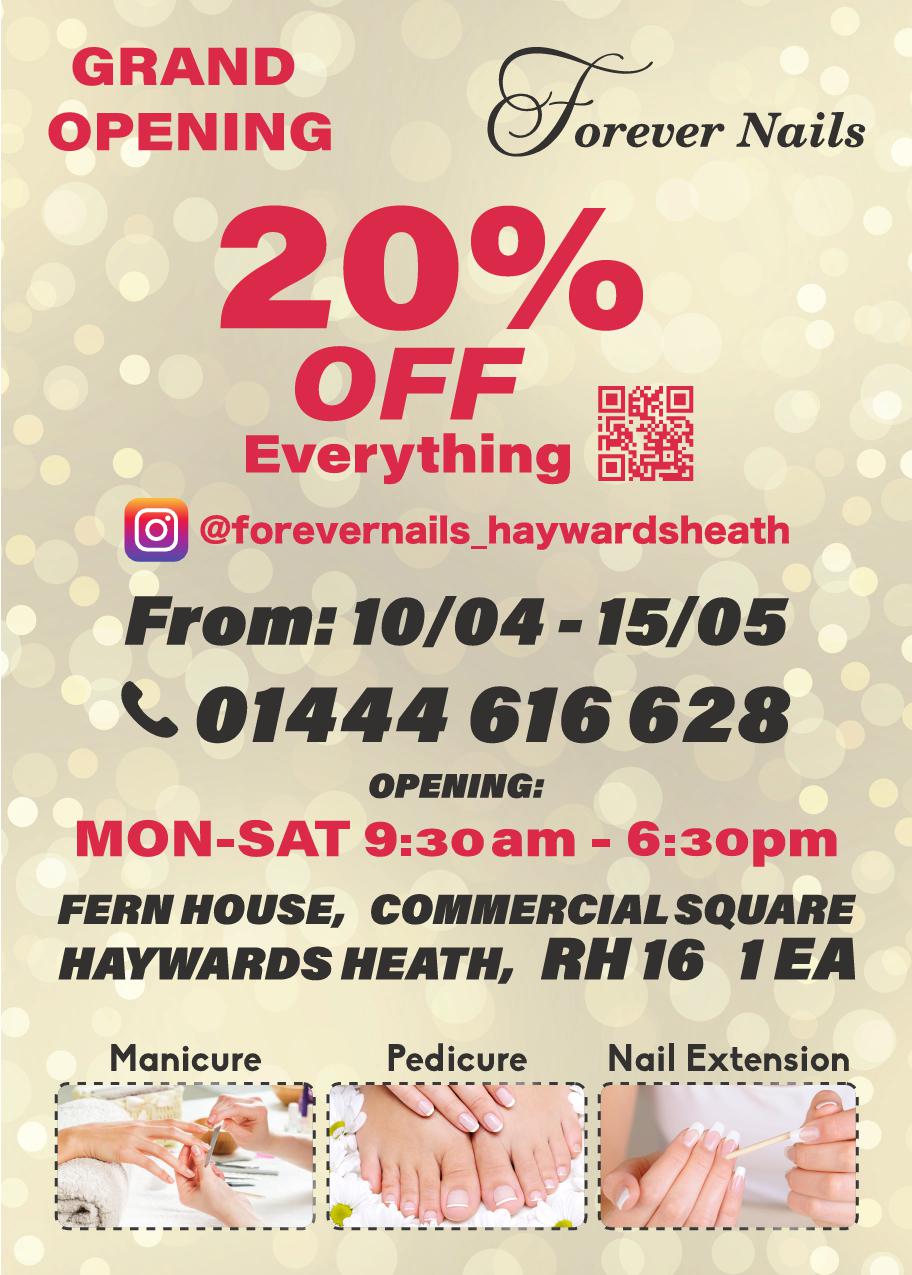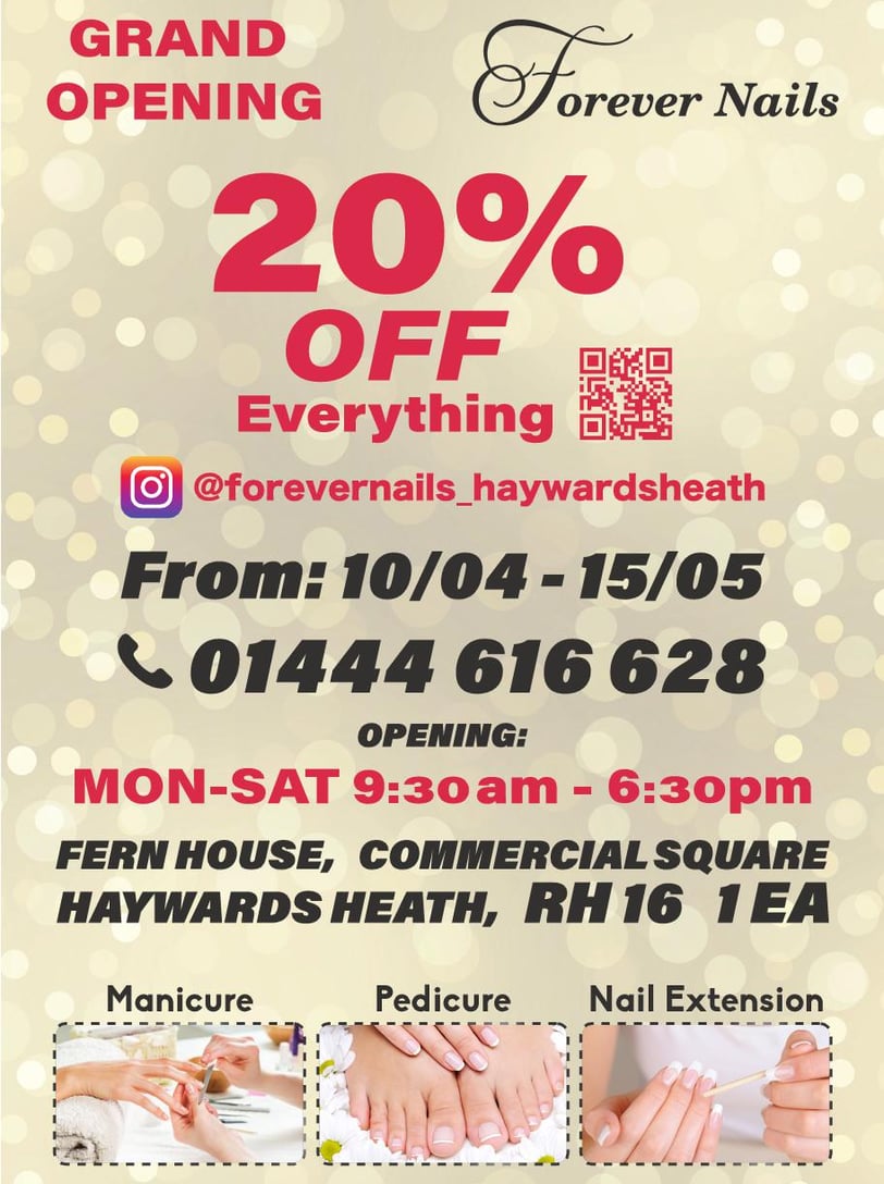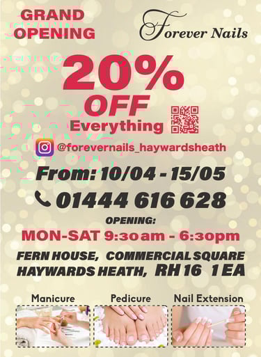 We are excited to announce the opening of our brand new nail salon near Haywards Heath Station. And to celebrate our grand opening, we are offering an exclusive 20% discount to all our new customers!